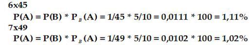 Предположим, что вероятность выбора одного любого шара из 49 шаров равна 1/45 (событие №1), а шар номер 7 выпадал за 10 тиражей 7 раз (событие №2). Какова вероятность выпадения этого шара в будущем. Эти два события зависимы, в этом случае они перемножаются. Тогда априорная вероятность выбора этого шара №7 в будущем равна: